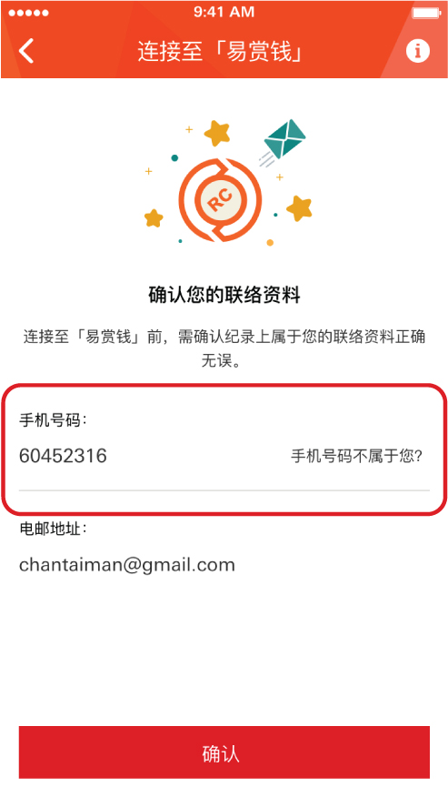 请确认联络资料正确。您于汇丰及「易赏钱」登记的手机号码必须一致。按「确认」以继续。
